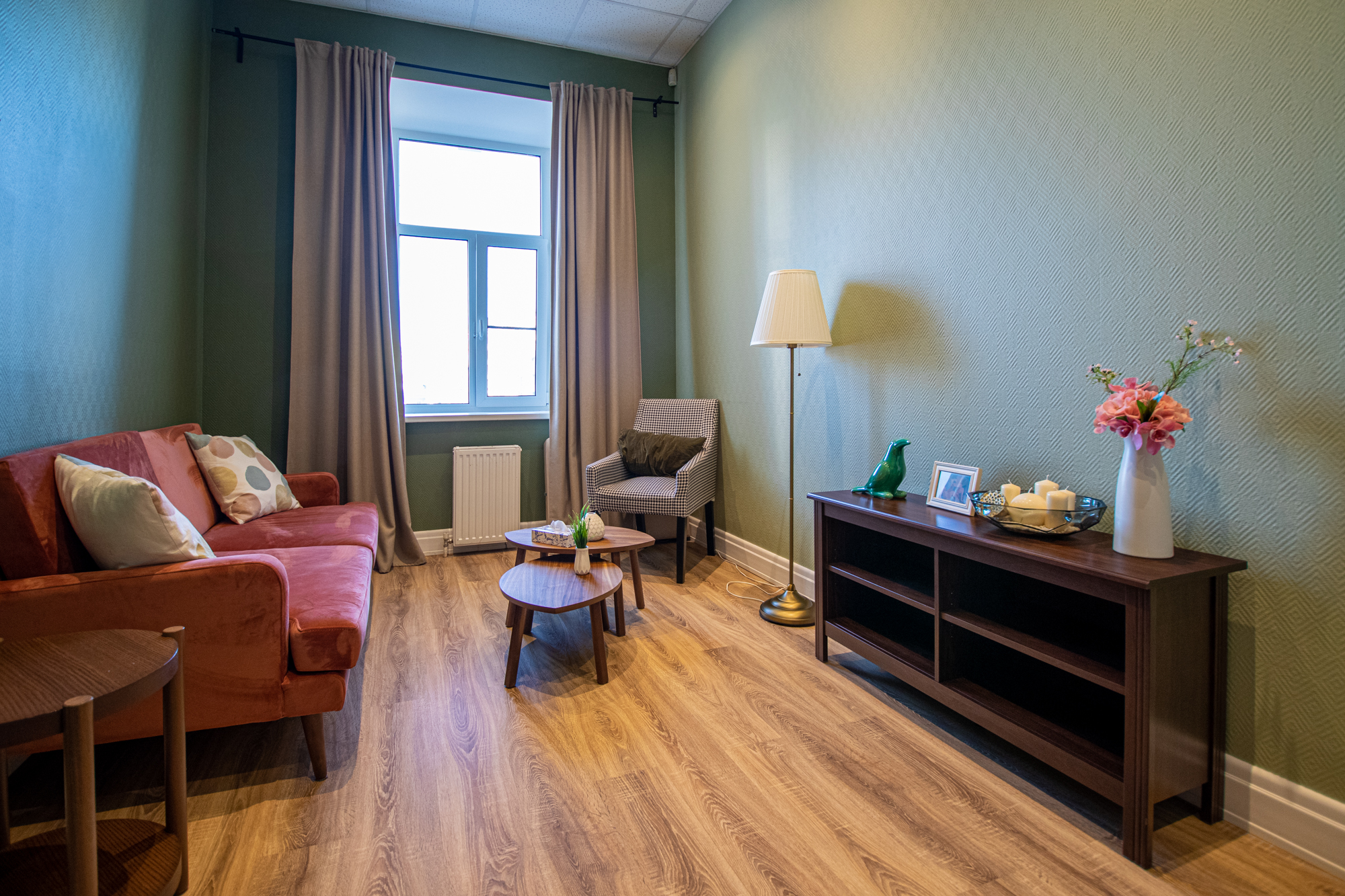 Преимущества нашего кабинета «Мятный»: Кабинет продуман для работы психоаналитиков. Для этого в нем расположена софа и кресло с журнальным столиком напротив. Имеется дополнительное мягкое освещение в виде торшера. Спокойные тона и дизайнерское оформление стен наполняют кабинет доброжелательной атмосферой.