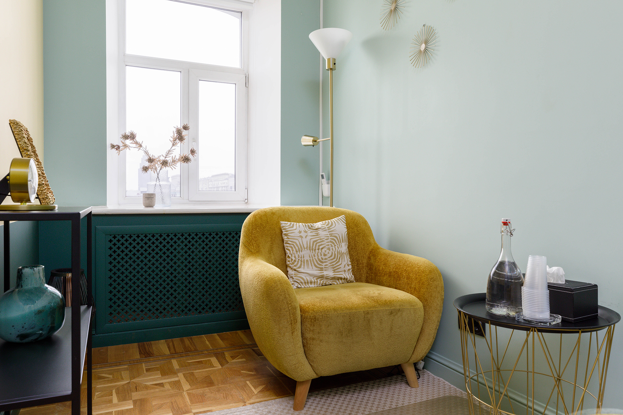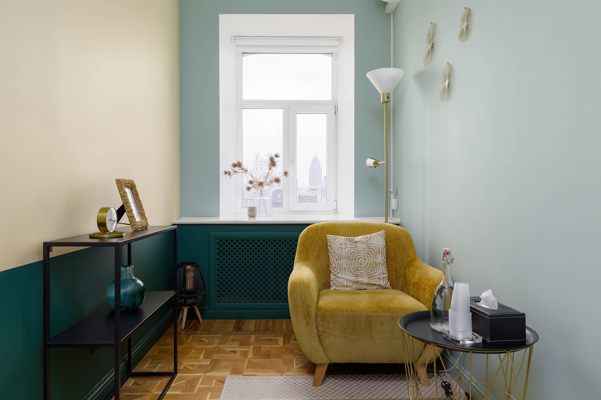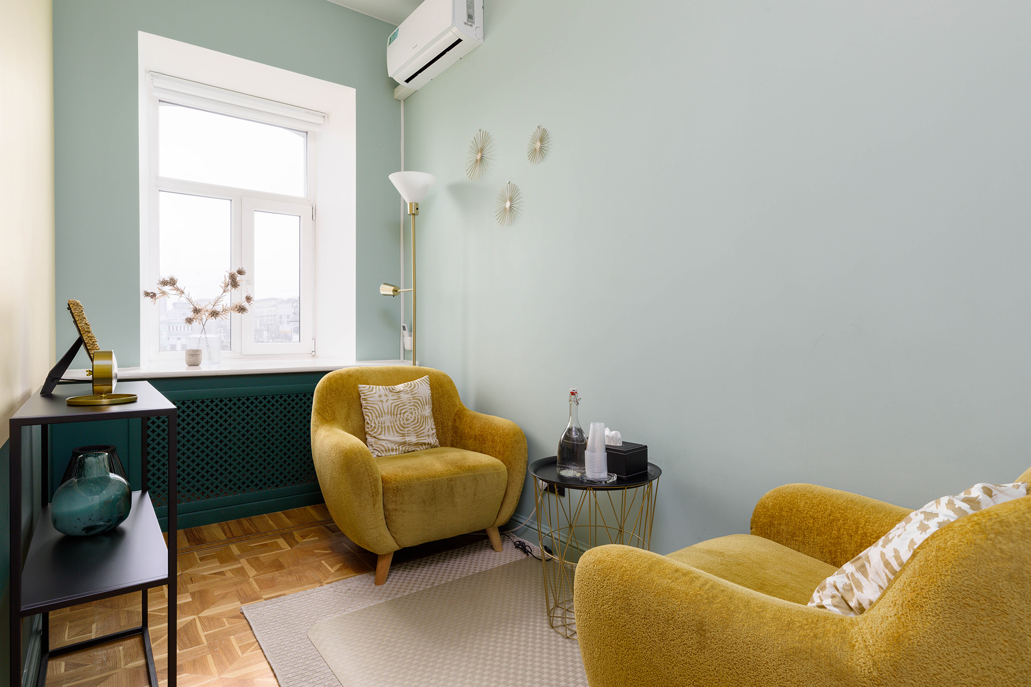 Кабинет предназначен для проведения индивидуальных консультаций, телесно-ориентированной психотерапии и массажа до 4-х человек.
