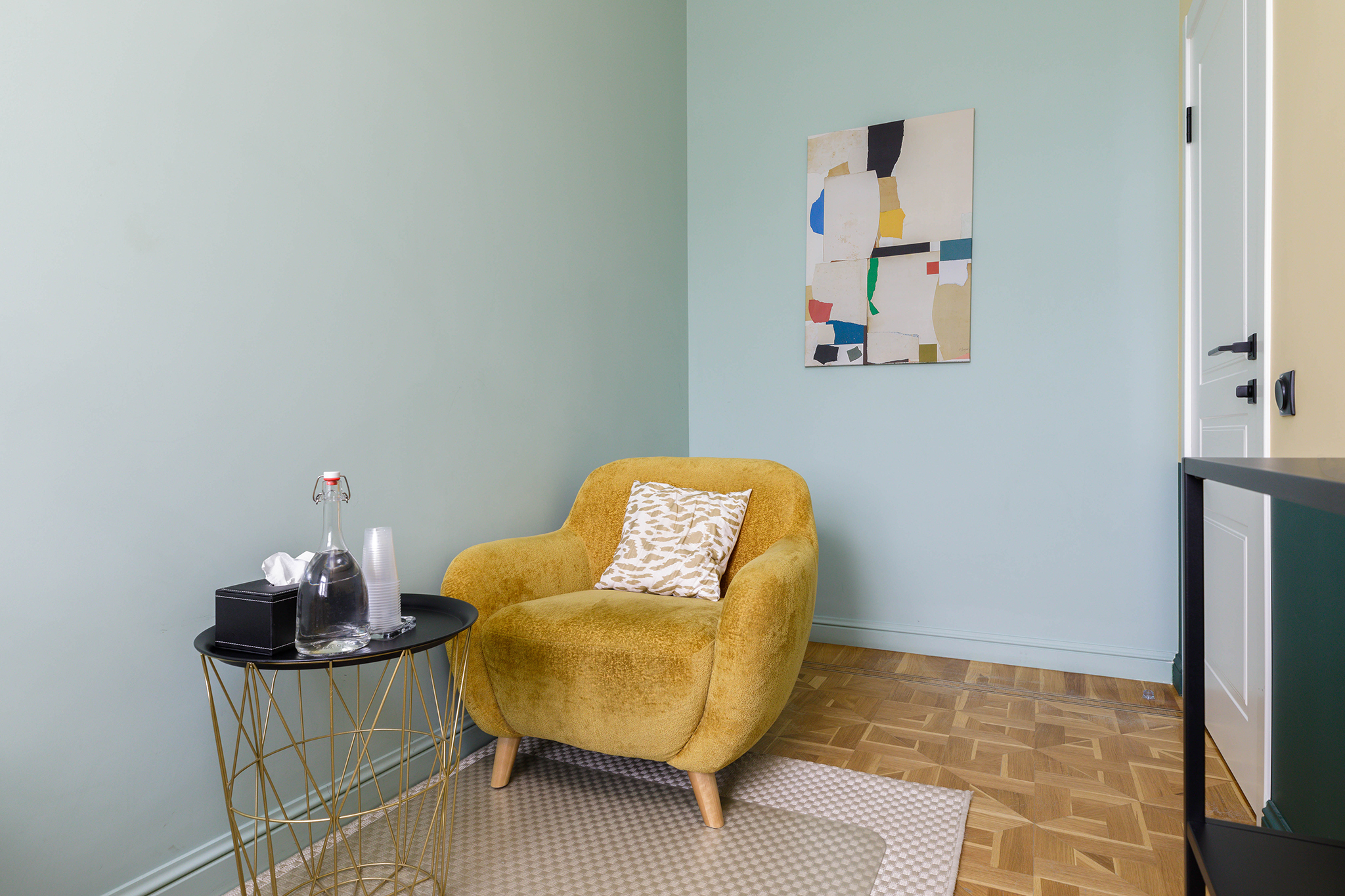Общая цветовая гамма обстановки выдержана в современных интерьерных решениях. В данном кабинете приятно находиться. Стильное, гармоничное и комфортное помещение создает доверительную, свободную обстановку. Поэтому посетитель, который пришел на прием к психологу, уверенно и спокойно может обсудить все существующие проблемы.