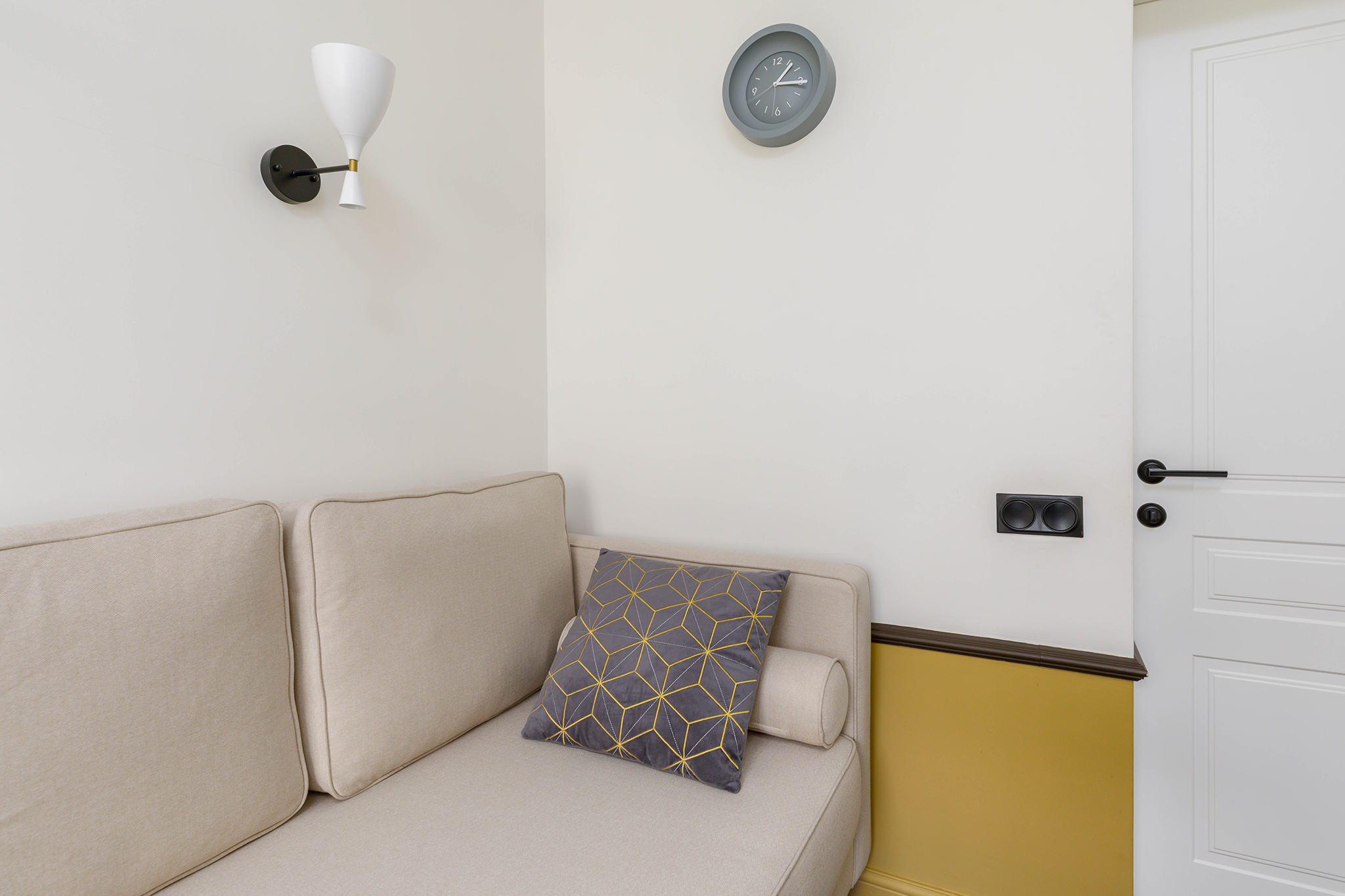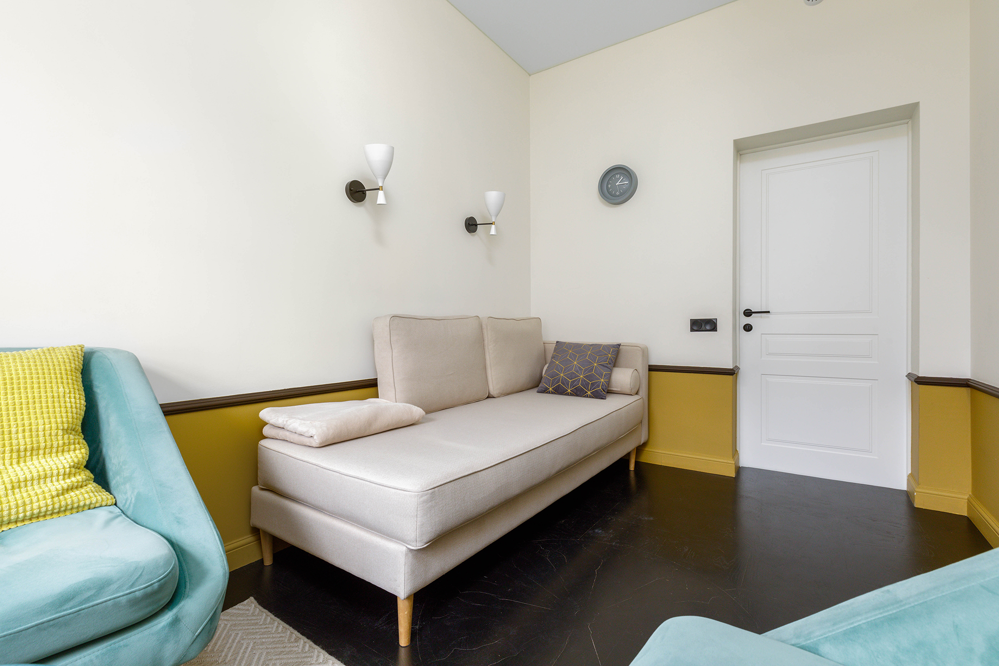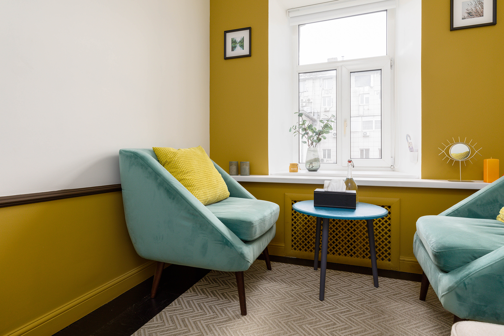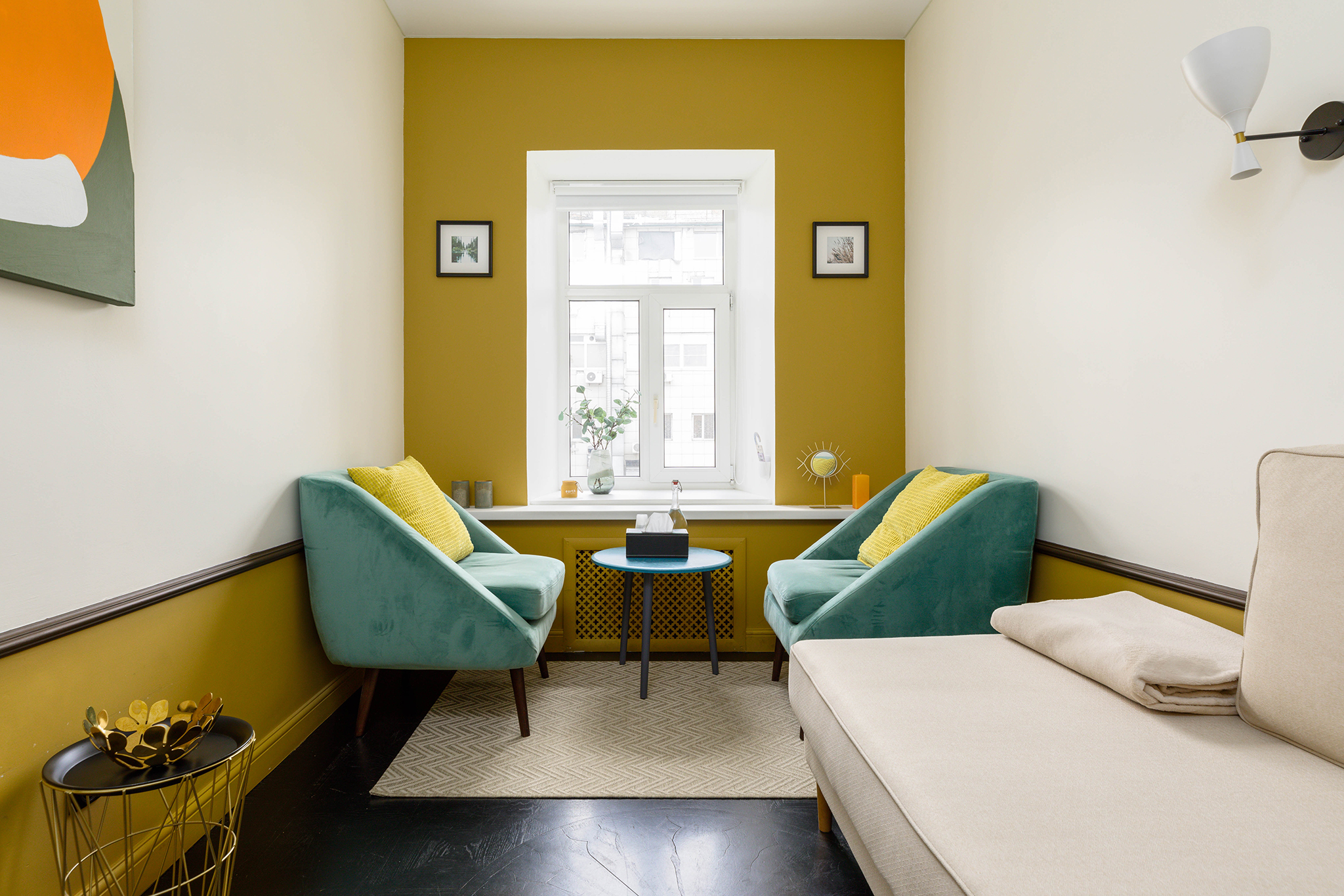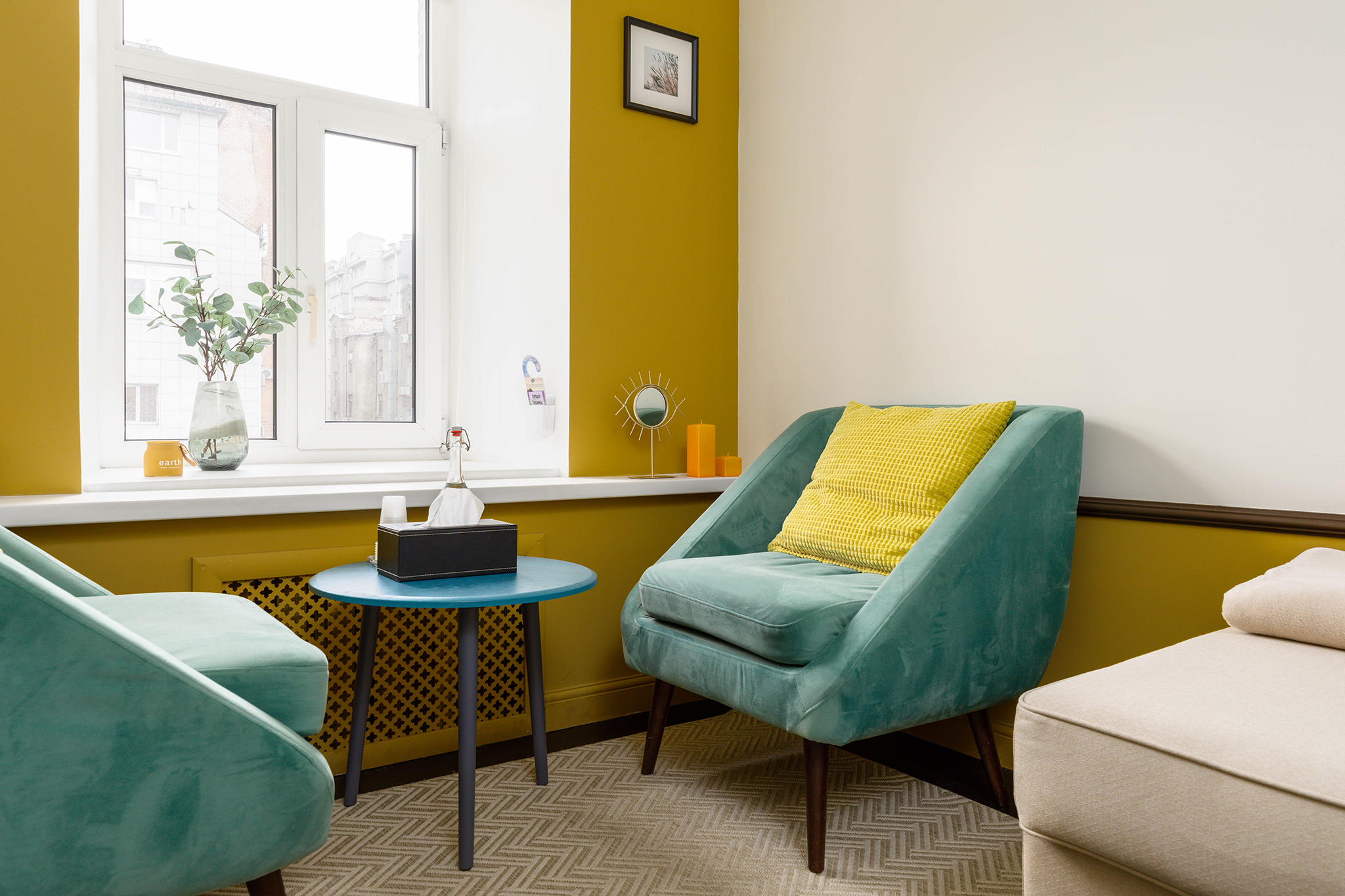 В кабинете представлены софа, мягкое кресло, журнальный столик. Общая цветовая гамма обстановки выдержана в постельных тонах, на стенах светильники. Такое оформление делает кабинет максимально комфортным и создает доверительную, свободную обстановку. Поэтому посетитель, который пришел на прием к психологу, уверенно и спокойно может обсудить все существующие проблемы.