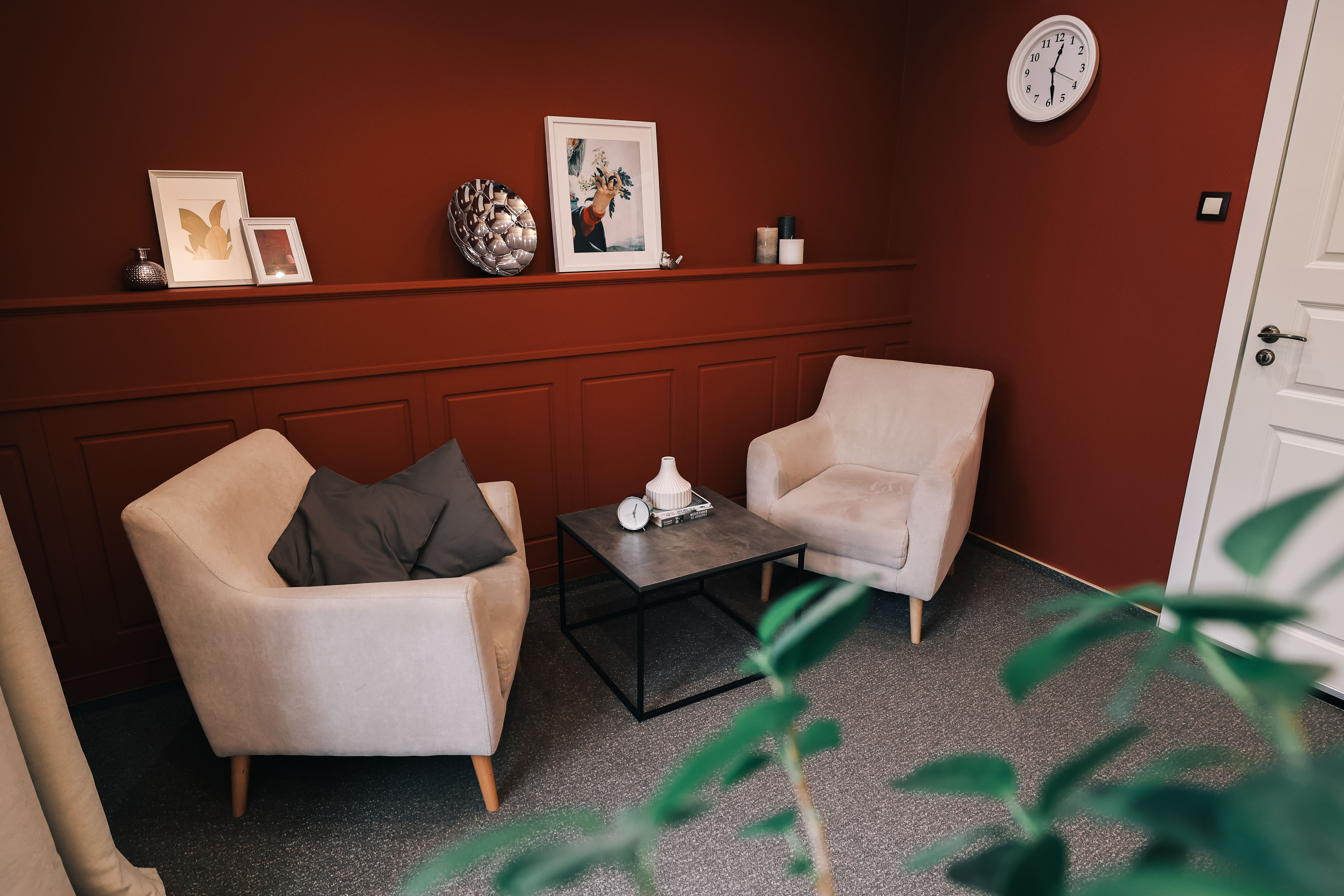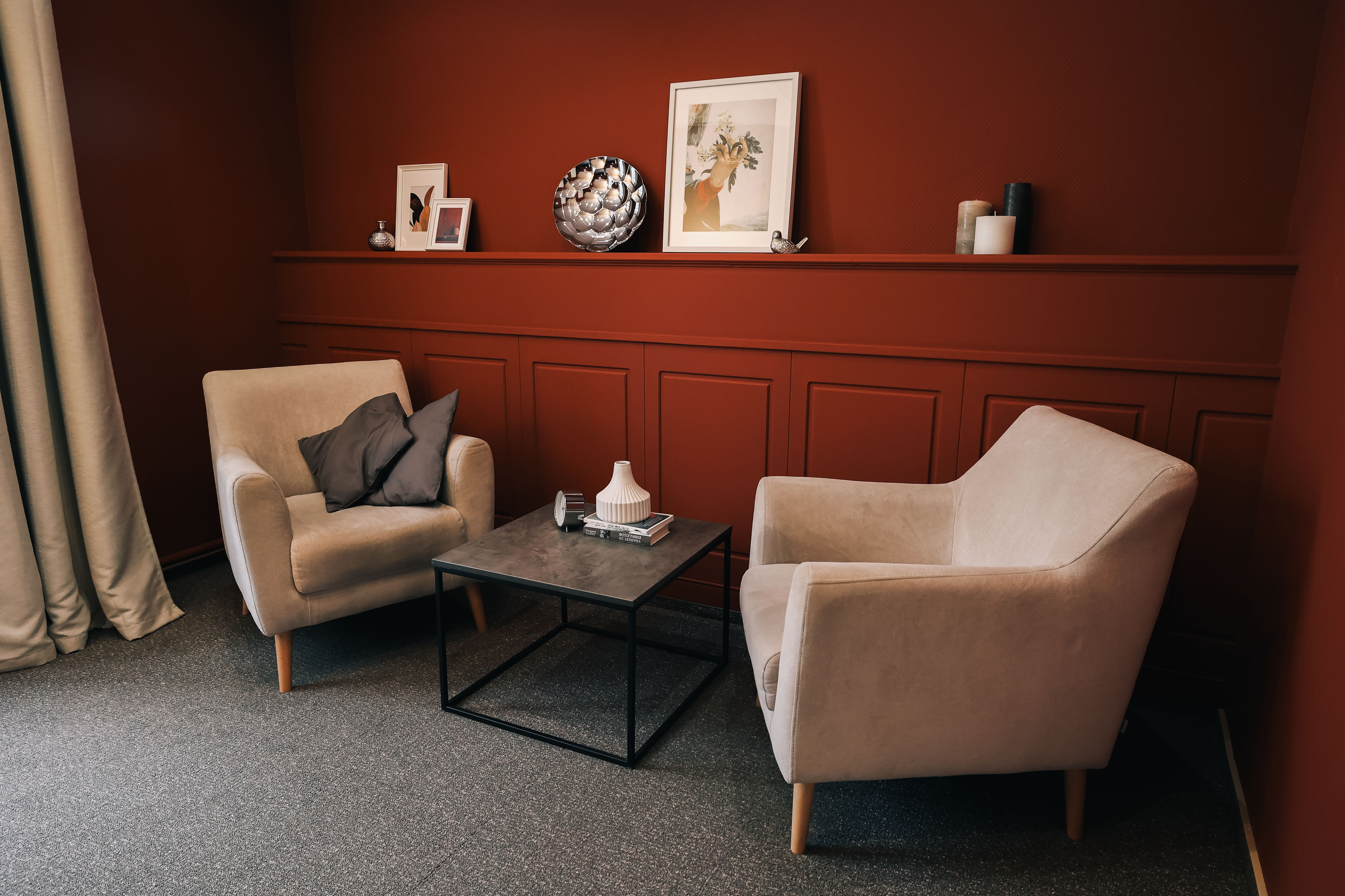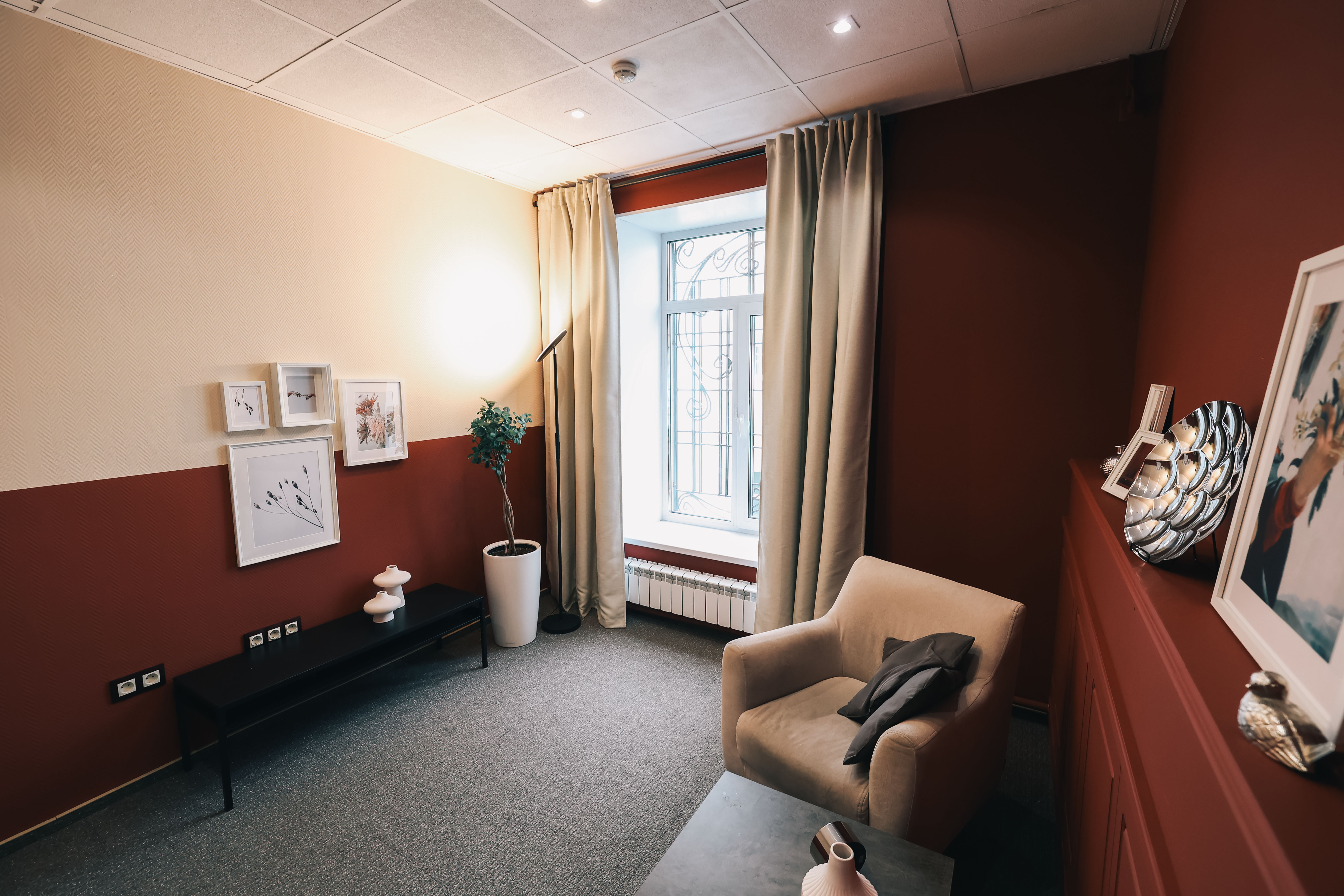Для проведения индивидуальных консультаций, семейной психотерапии, психотерапевтических занятий. Также арендовать этот кабинет могут и специалисты работающие с мануальными практиками — в кабинете есть массажный стол.