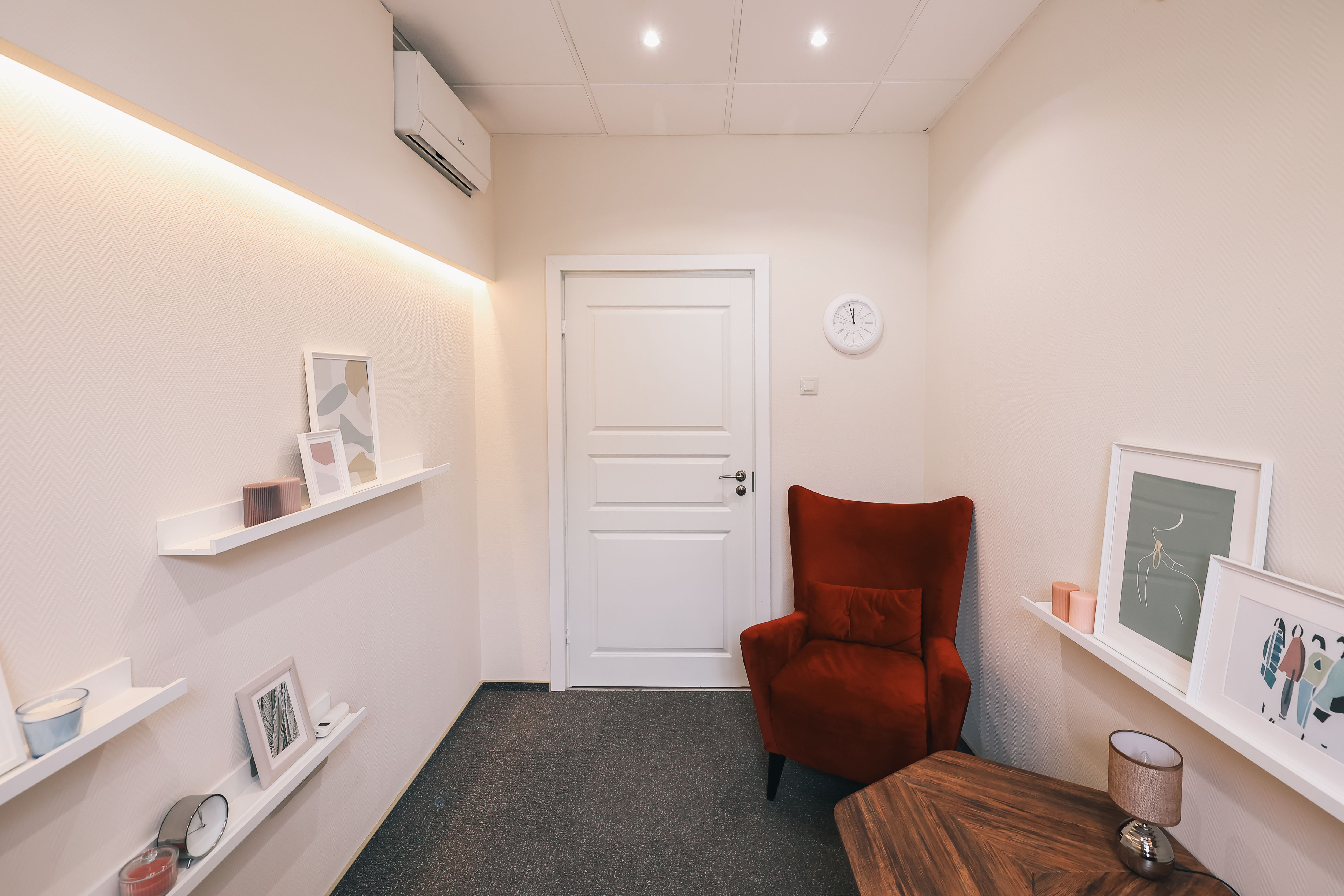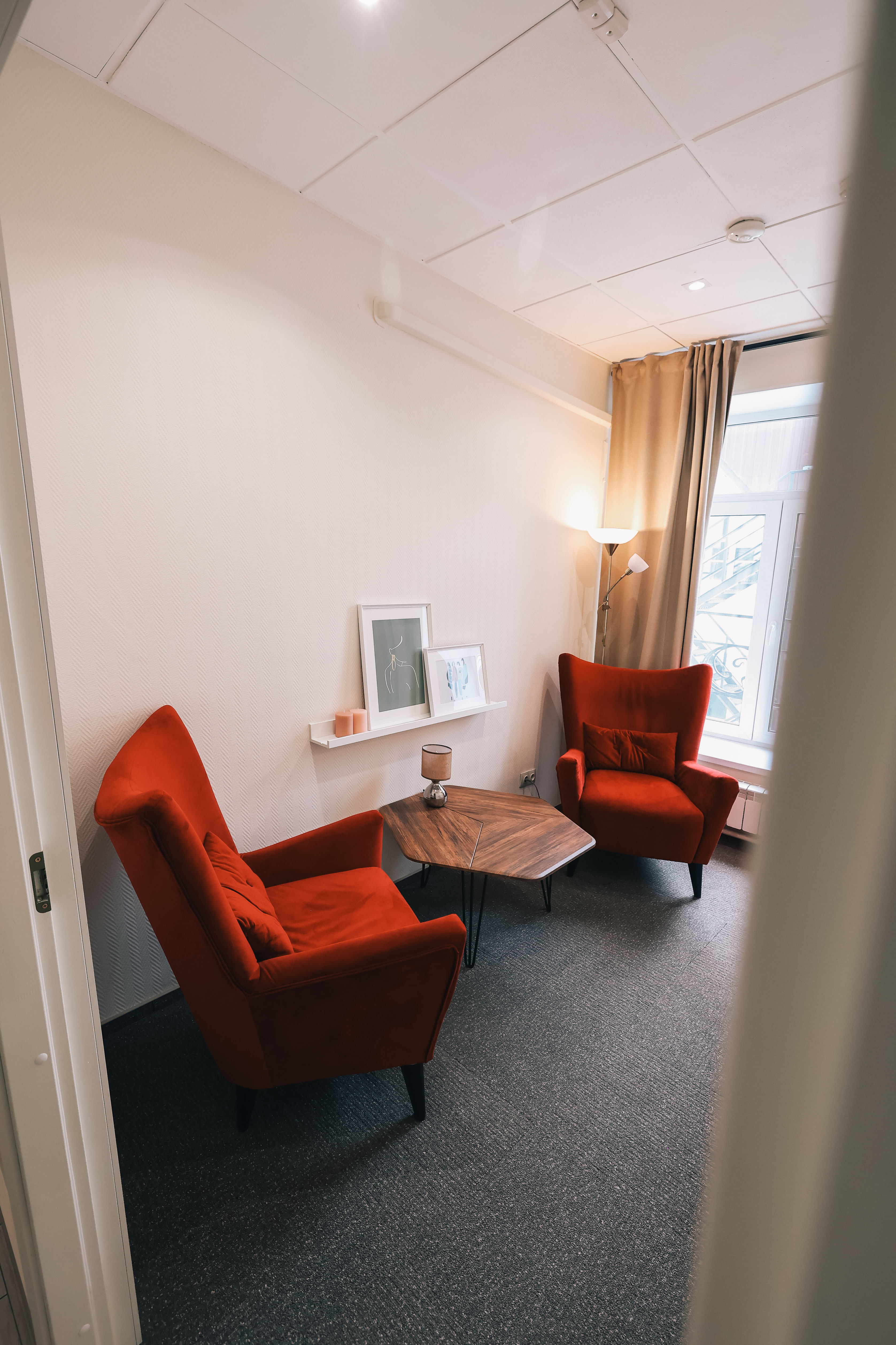 Бордовый кабинет предназначен для проведения индивидуальных консультаций, однако, он достаточно просторный, что позволяет поставить третье кресло для проведения семейных консультаций.