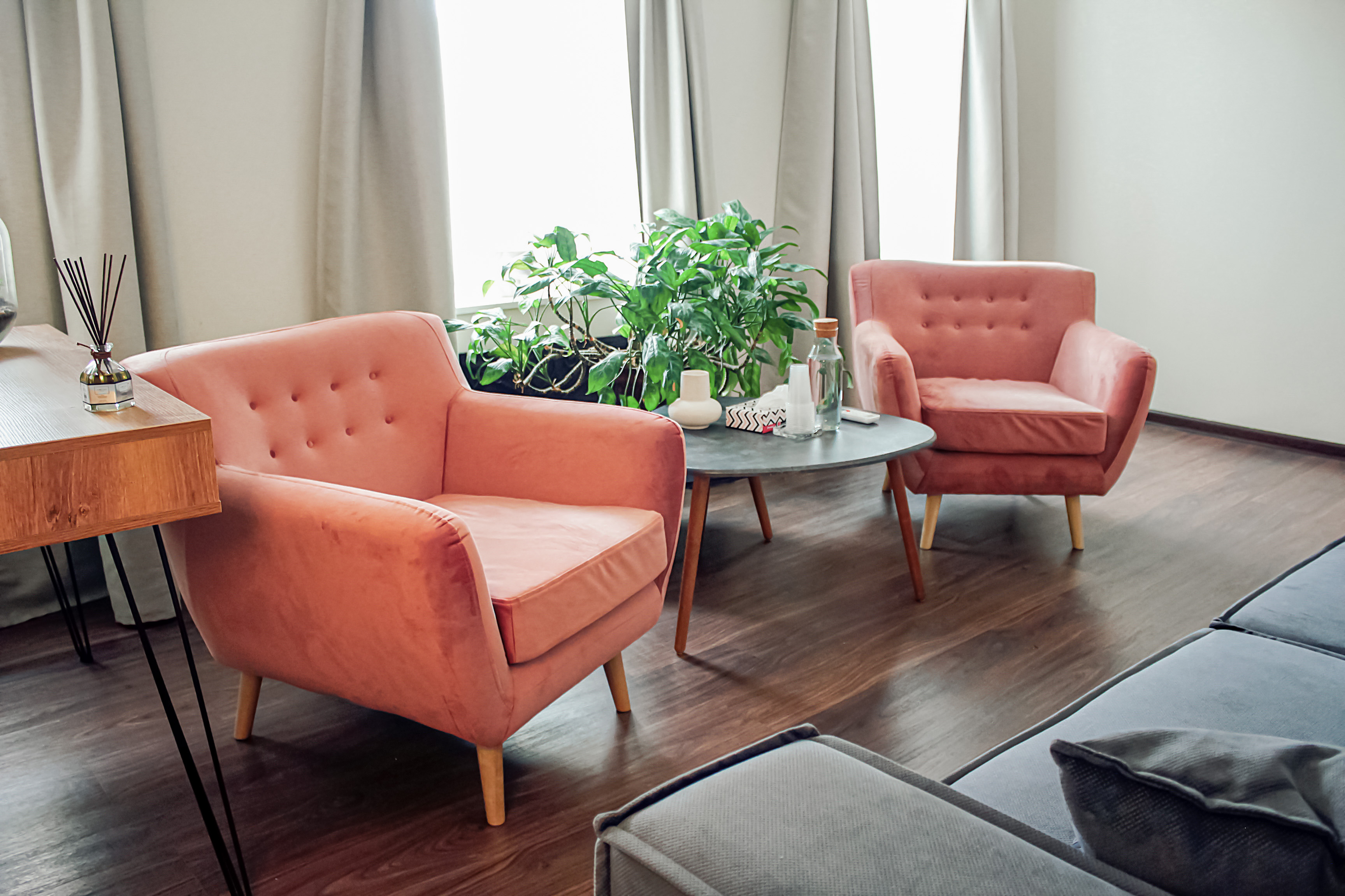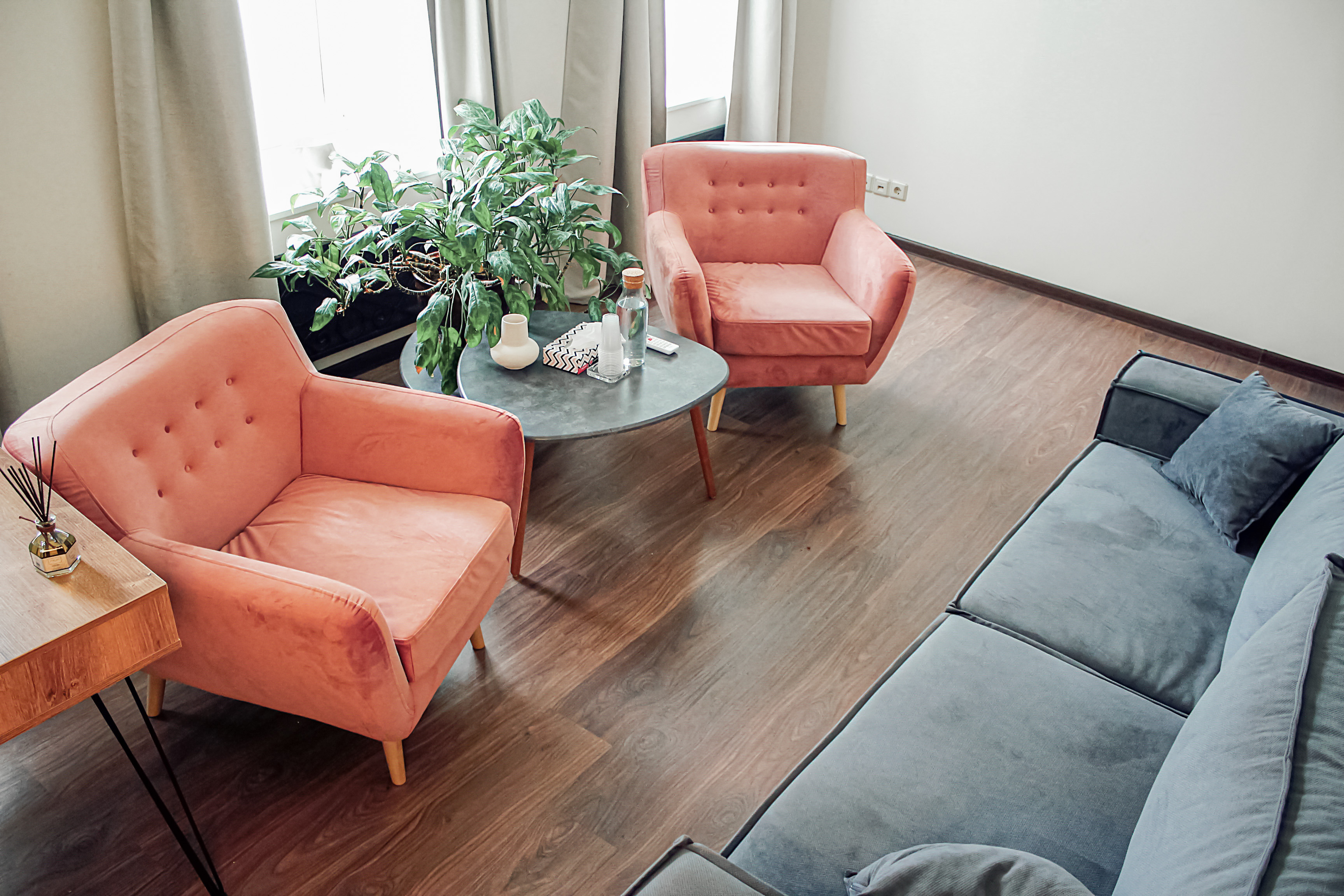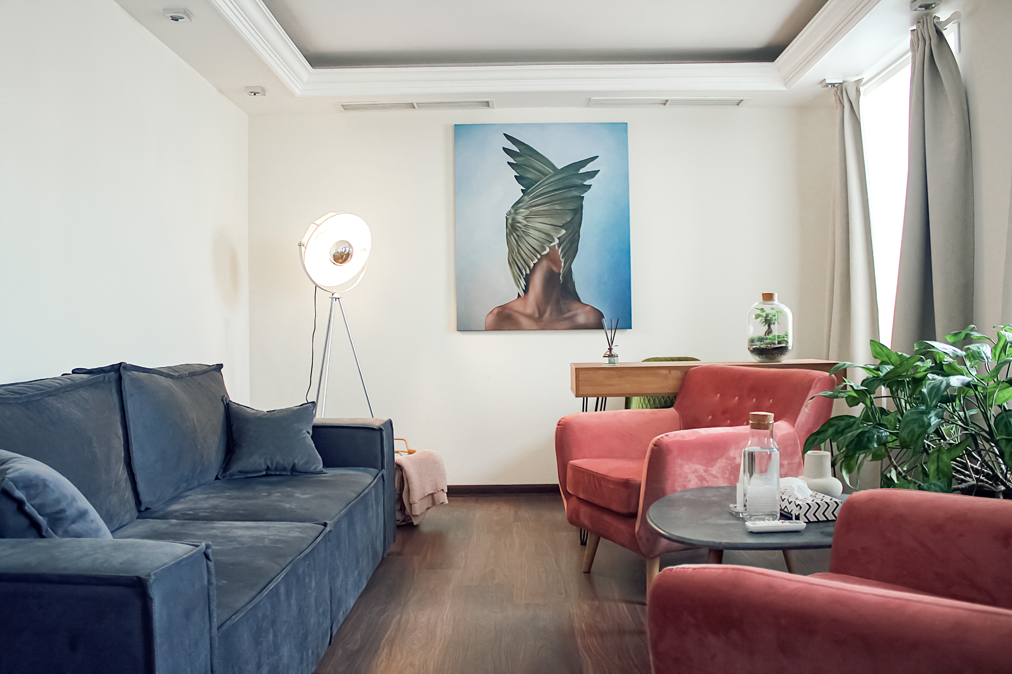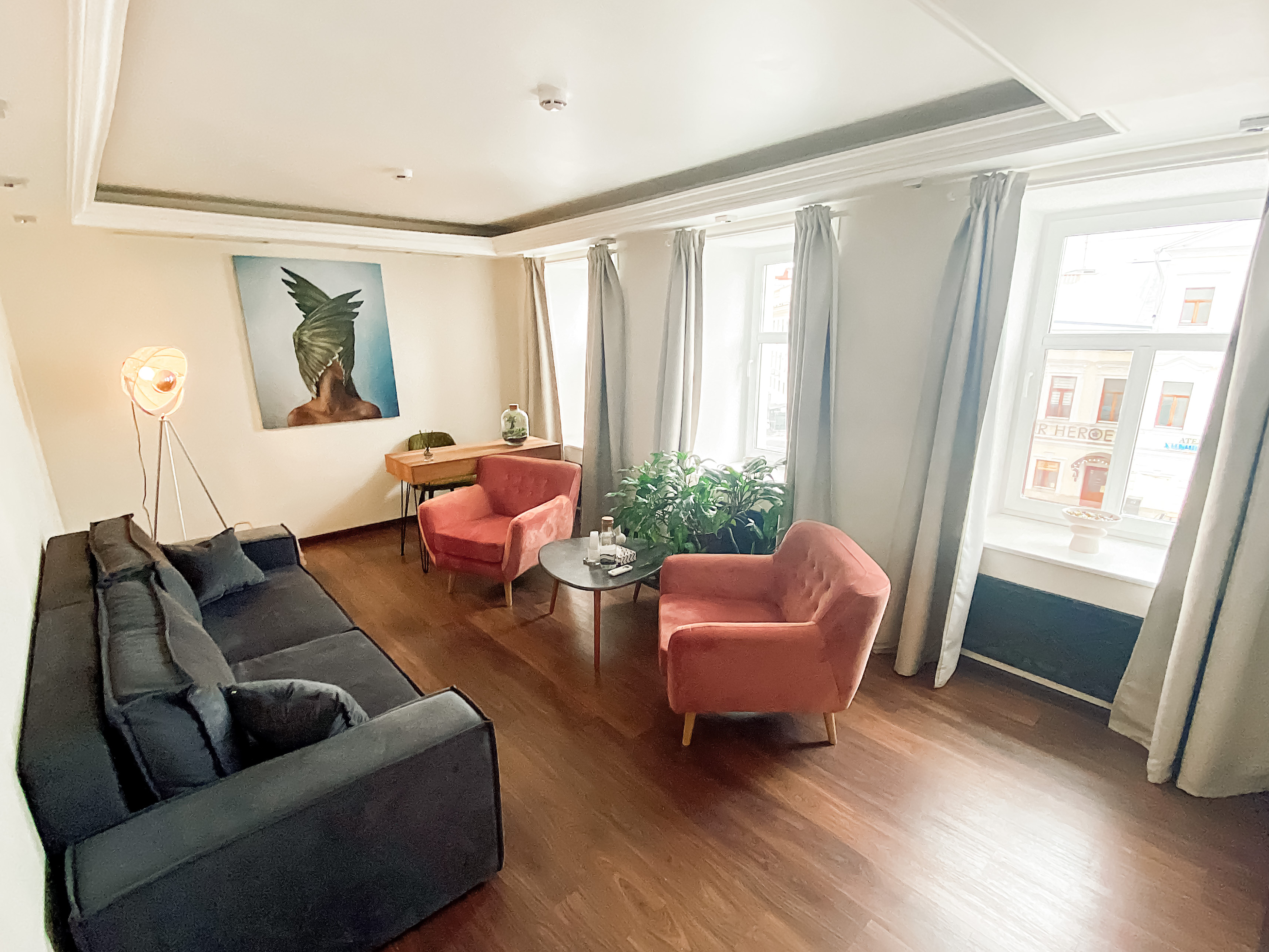 Большой кабинет с 3-мя окнами. Меблирован 2-мя большими креслами, диваном с письменным столом и журнальным столиком. В качестве дополнительного освещения установлен стильный торшер. Стена декорирована крупной картиной.