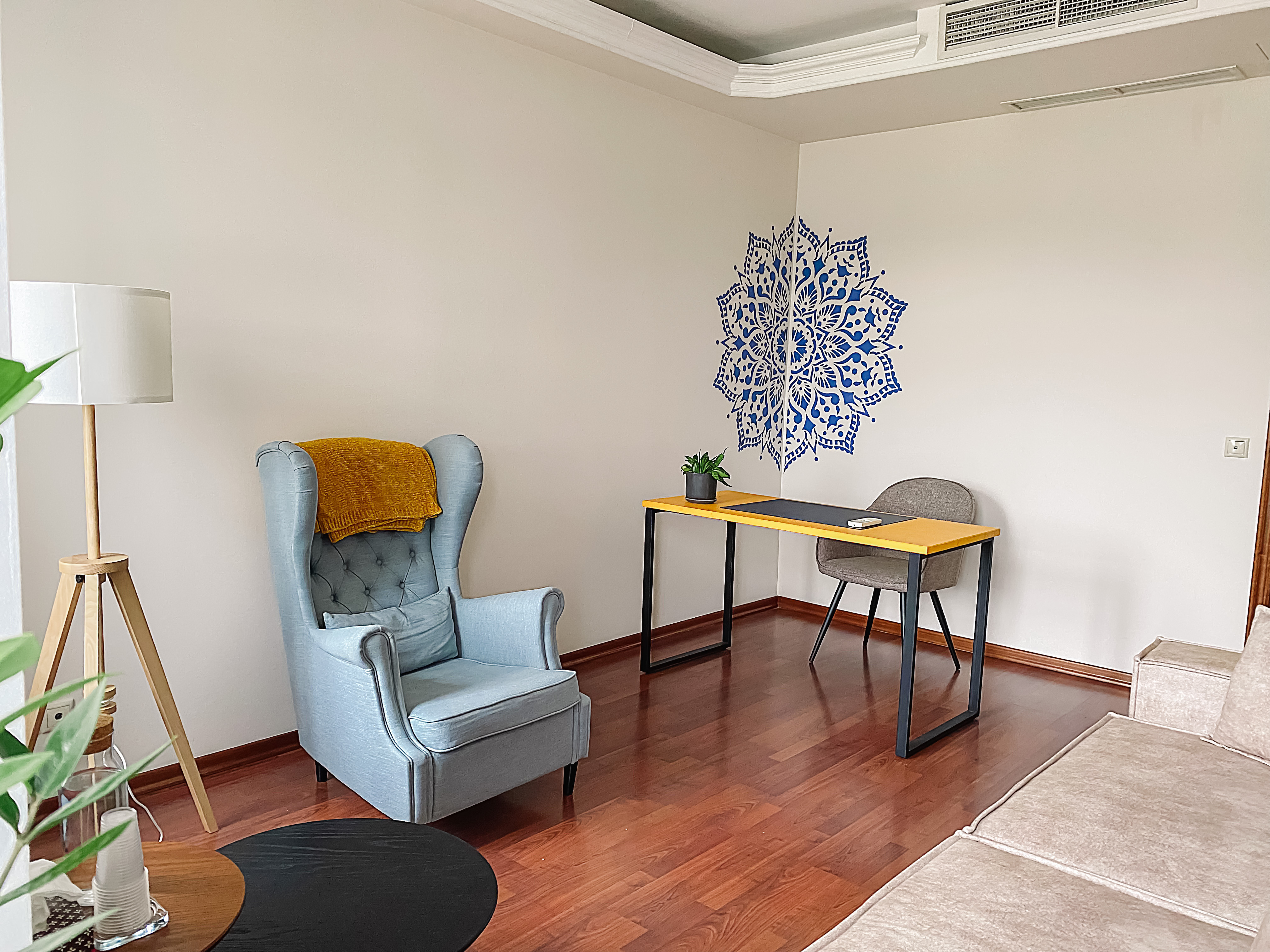 Кабинет с 2-мя окнами, диваном, письменным столом и 2-мя креслами. Общая цветовая гамма выдержана в бежевых тонах. Используется дополнительное мягкое освещение в виде торшера, все это делает кабинет максимально комфортным